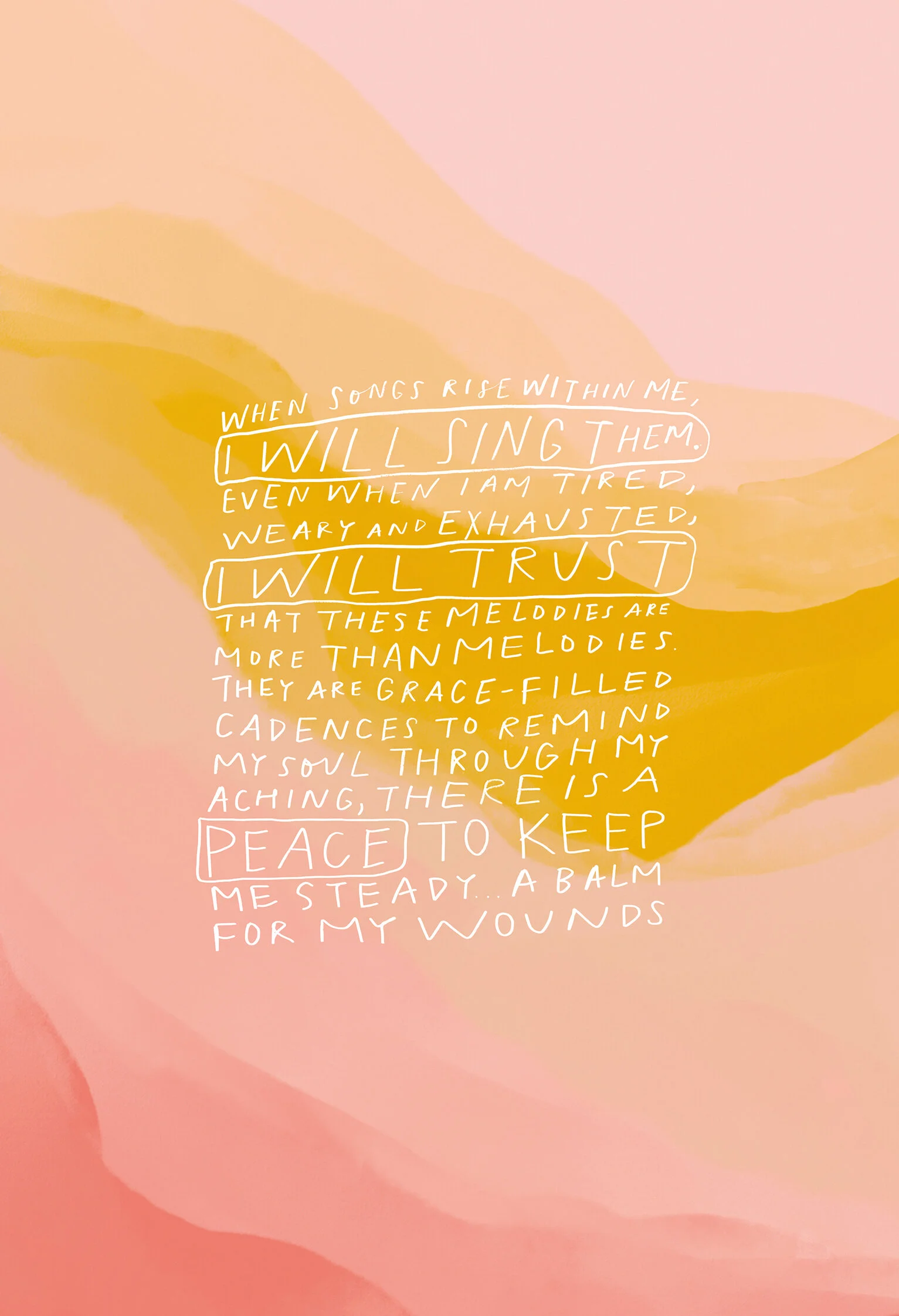 All Along You Were Blooming pairs Nichols’ original artworks with all-new poetry, inspired by her own followers. Nichols can’t remember the story behind the line that became her book title, though she tells me, “I really wish that I could.” One could hardly blame her for having trouble nailing it down—since 2017, she’s been collecting personal stories from those who reach out to her—often of personal turmoil, heartache, and disillusionment. She uses each story to craft a poem that speaks peace and hope into suffering, a modern-day oracle of sorts. Nichols’ is fine-tuned into the spirit of her readers; she can read the spirit of messages that are shared with her and respond with the poetic equivalent of perfect pitch, each poem an echo of the feeling being shared but with some added lilt; a gentle reminder to look up. Nichols calls these collisions of art, benediction, generosity, and belief, “poem letters.” While these letters speak honestly of grief, disappointments, and hardship, they read like blessings.